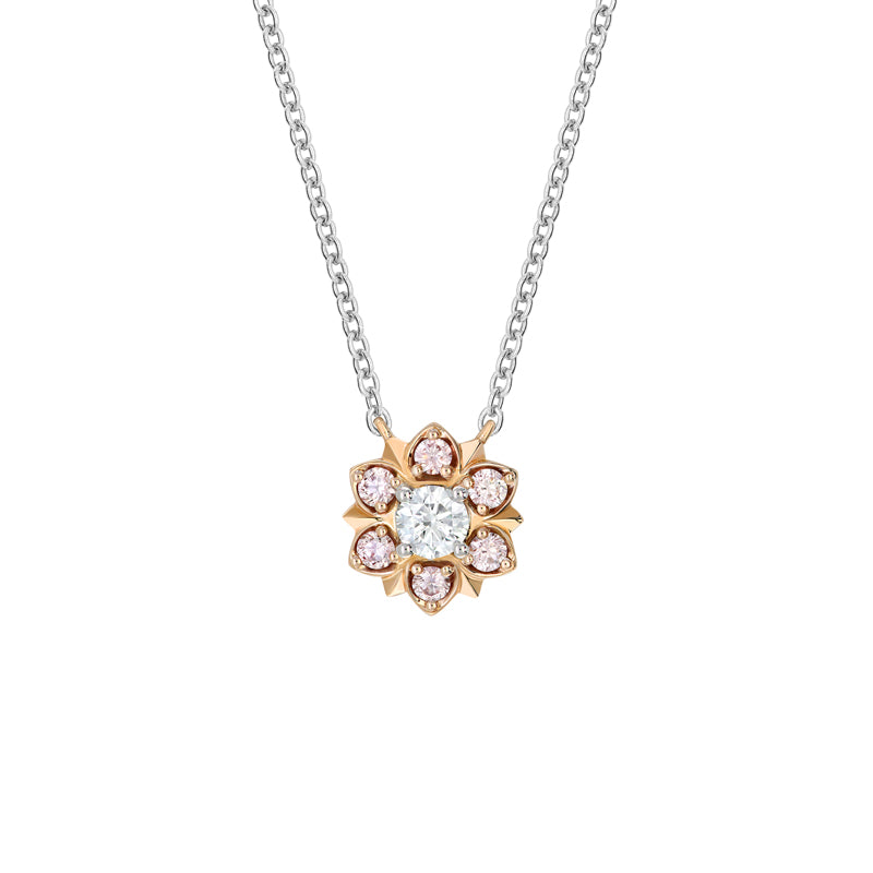 ラウンドブリリアントカットのホワイトダイヤモンドが、美しいアーガイルピンクダイヤモンドの花輪に囲まれています。18カラットのホワイトゴールドチェーンにセットされた Nina は、さりげない洗練さを醸し出し、印象に残ること間違いなしです。