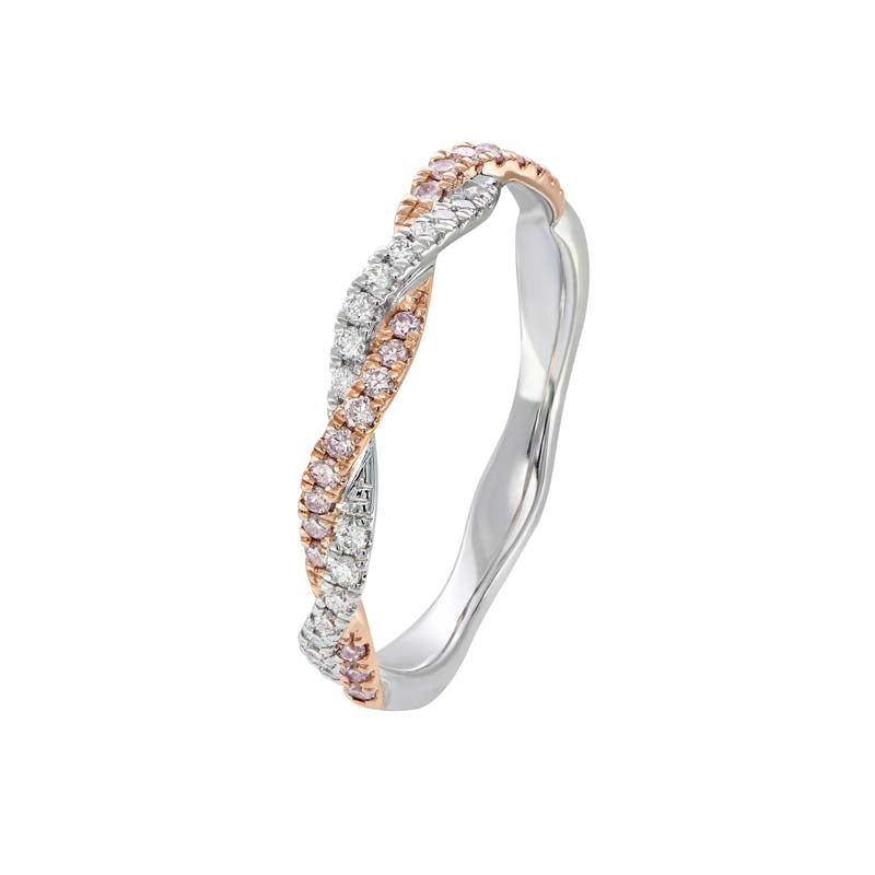 飽きることのない新しいコレクション。アナベル リングは、絡み合うデザインと、ラウンド ブリリアント カットのホワイト ダイヤモンド 20 個とピンク ダイヤモンド 20 個のハーモニーが特徴です。
