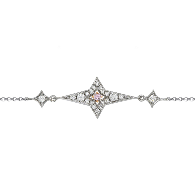 The Kimberley Starflake Bracelet is a celestial-inspired treasure, capturing the brilliance of starlight in an elegant design. Crafted in 18ct white gold, the central star motif sparkles with an array of fine white diamonds, highlighted by rare Argyle pink diamonds at its heart. Delicate diamond accents extend outward, creating a graceful constellation effect along the fine chain. A modern yet timeless bracelet, it brings a touch of radiance and wonder to any occasion.