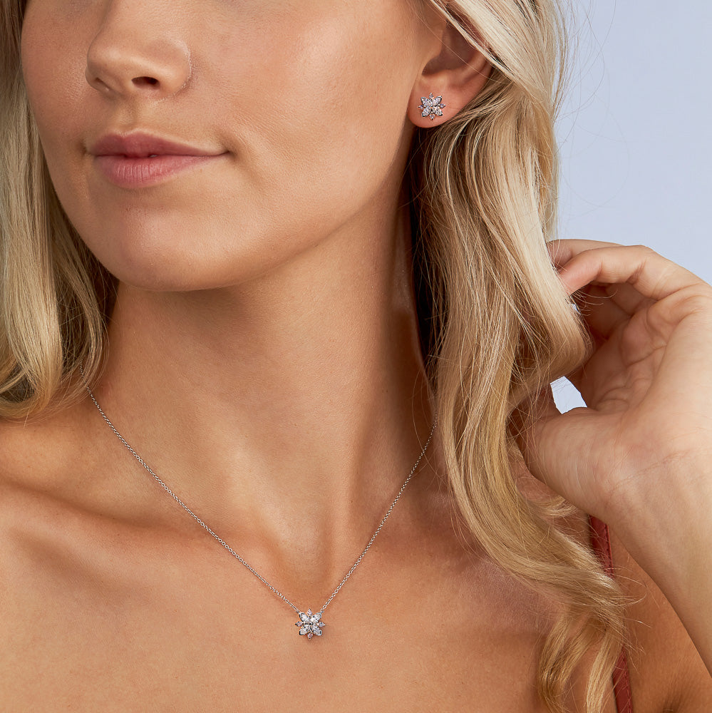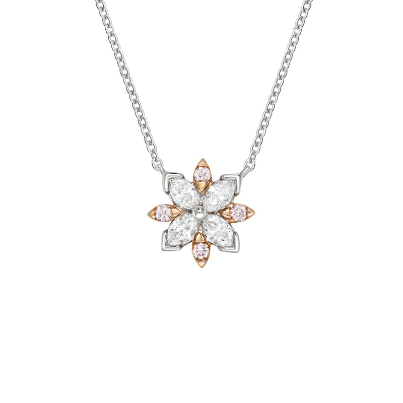 Radiant and graceful, the Blush Estelle Necklace blossoms with timeless beauty. Crafted in 18ct rose and white gold, its marquise-cut white diamonds form delicate petals accented by natural Argyle pink diamonds, creating a sparkling floral motif. Suspended from a fine white gold chain, this necklace brings a touch of nature’s elegance to everyday style and adds effortless charm to life’s most special occasions.