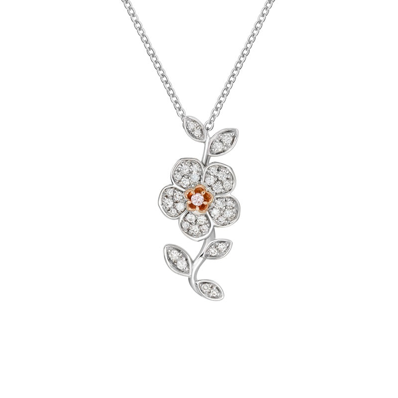 Romantic and graceful, the Blush Sakura Necklace blooms with timeless charm. Crafted in 18ct rose and white gold, its delicate flower sparkles with brilliant white diamonds and a natural Argyle pink diamond at its heart, echoing the fleeting beauty of cherry blossoms. Perfect for adding elegance to everyday style or a floral touch to special occasions, this necklace is a symbol of femininity and refined luxury.