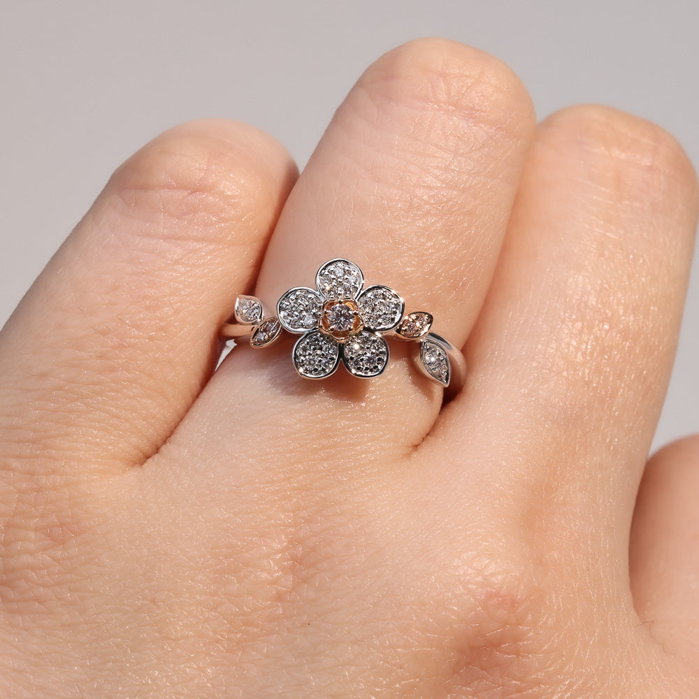 Romantic and graceful, the Blush Sakura Ring blooms with timeless charm. Crafted in 18ct rose and white gold, its delicate flower sparkles with brilliant white diamonds and a natural Argyle pink diamond at its heart, capturing the fleeting beauty of cherry blossoms. A feminine piece that feels just as enchanting for everyday wear as it does for special occasions, this ring is a symbol of elegance and refined luxury.