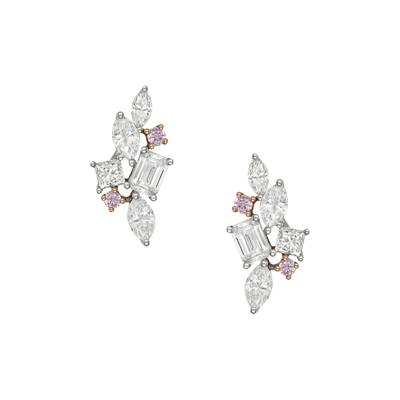 Exuding contemporary elegance, the Kimberley Brianna Earrings are crafted in 18ct rose and white gold, showcasing an artful arrangement of marquise, emerald, and princess-cut white diamonds. Delicate Argyle pink diamonds add a rare touch of colour, creating a captivating balance of brilliance and sophistication.