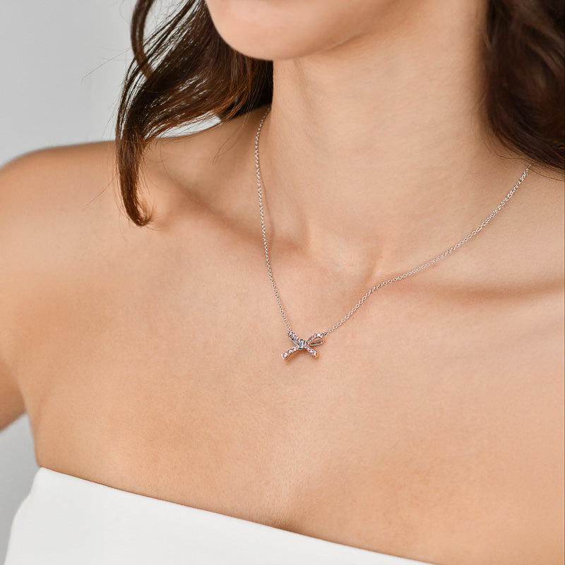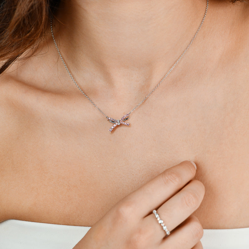 In 18ct rose and white gold, the Kimberley Boden Necklace features a graceful bow set with rare Argyle pink diamonds and a single white diamond baguette. A delicate expression of timeless femininity.