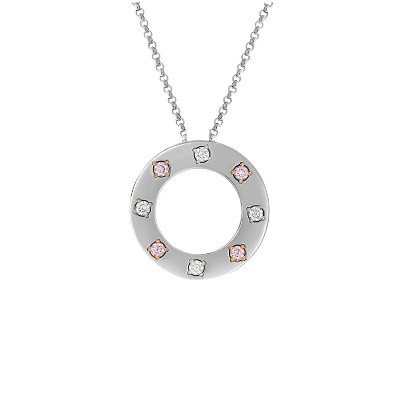 Crafted in 18ct rose and white gold, the Kimberley Lila Necklace features a sleek circular pendant adorned with alternating Argyle pink and brilliant white diamonds. A modern classic with a subtle touch of colour and elegance.