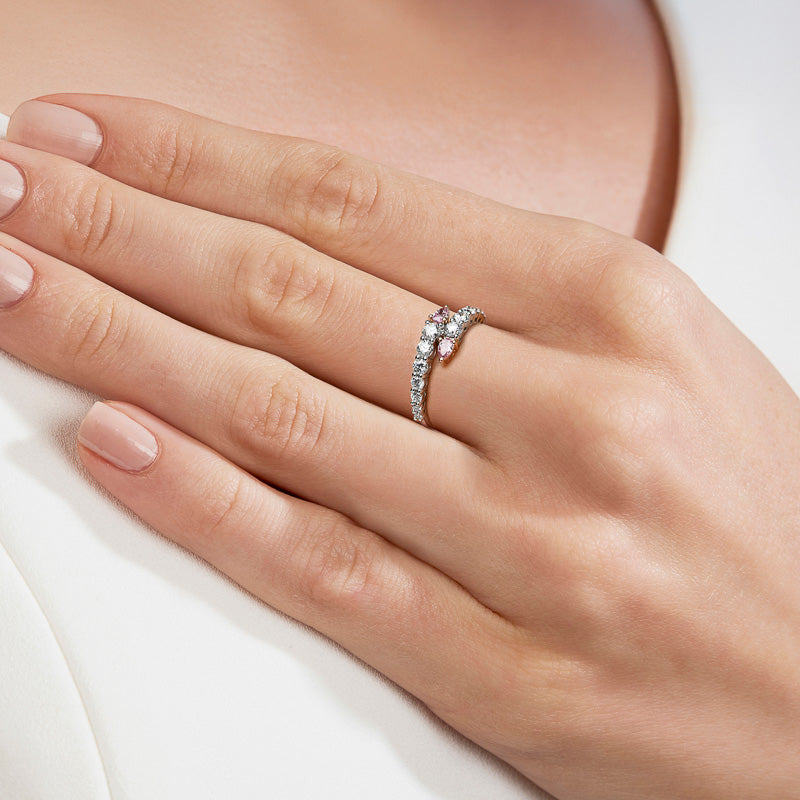 Elegant and distinctive, the Kimberley Sabrina Ring features two pear-shaped Argyle pink diamonds framed by a sweeping band of brilliant white diamonds. A graceful design that beautifully balances rare colour with radiant sparkle.