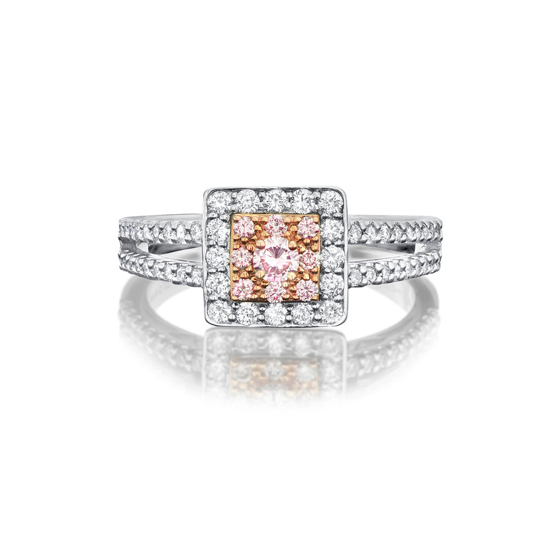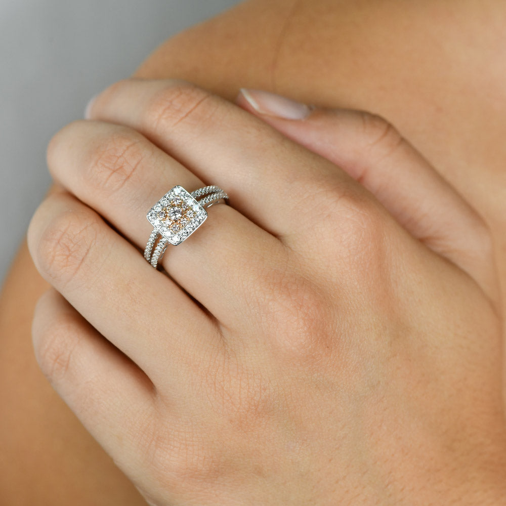 Classic and elegant, the Blush Tess ring features a square cluster of fancy light pink diamonds, surrounded by a sparkling halo of white diamonds. Set on a white diamond embellished split band, this ring is chic and subtle, adding an stunning touch of rare luxury to your daily style, capturing the beauty of pink diamonds from the Argyle mine.