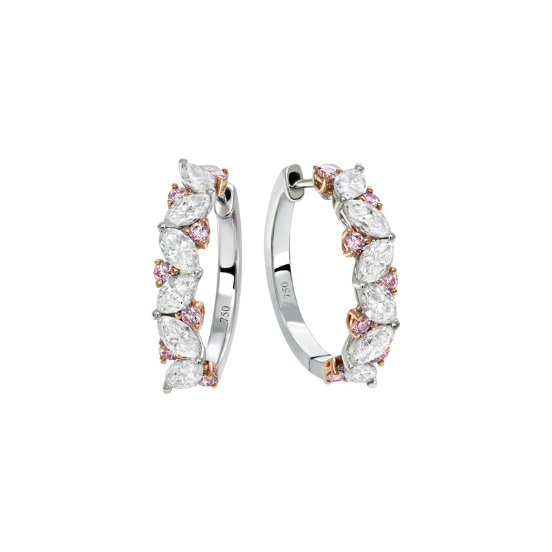 The Kimberley Skye Earrings feature a captivating blend of marquise-cut white diamonds and round Argyle pink diamonds, creating an elegant hoop design that radiates brilliance from every angle. A timeless statement of refined beauty.