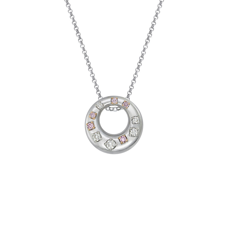 The Kimberley Isola Necklace is a statement of understated elegance. Crafted in 18ct white and rose gold, the circular pendant is accented with a harmonious mix of rare Argyle pink diamonds and white diamonds, symbolising balance and unity. Its modern yet timeless design makes it the perfect piece for everyday wear, while its delicate sparkle adds a refined touch of luxury to evening occasions.