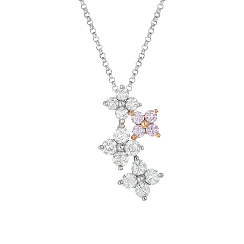 Delicate and radiant, the Kimberley Tinka Necklace features a floral cascade of brilliant white diamonds accented by rare Argyle pink diamonds. Crafted in 18ct rose and white gold, this enchanting design evokes femininity and grace with every detail. A timeless piece inspired by nature’s elegance and crafted with precision, it offers rare beauty and versatile luxury.