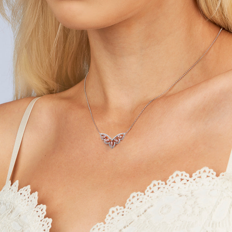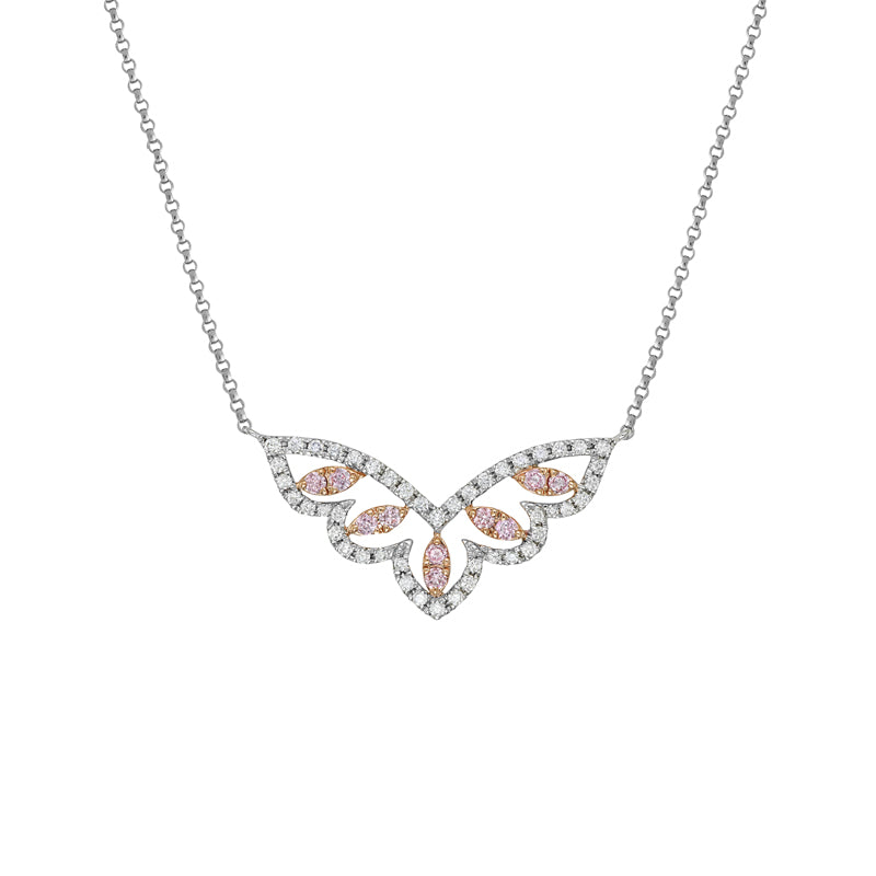 Elegant and refined, the Kimberley Vanessa Necklace features a sweeping design of brilliant white diamonds delicately accented by rare Argyle pink diamonds. Crafted in 18ct rose and white gold with a flowing silhouette, this piece echoes the wings of a butterfly in flight. Finished with a white gold chain, it’s a graceful statement of timeless luxury and femininity.