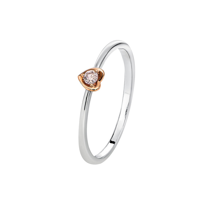 Petite and delicate, the Blush Yuriko ring displays a single fancy light pink diamond, set in a rose gold claw and heart shaped rose gold cup. This ring adds a subtle, sentimental touch to your daily styling, inserting the rare beauty of Australian pink diamonds from the Argyle mine, crafted in 18ct rose gold and set on an 18ct white gold band.