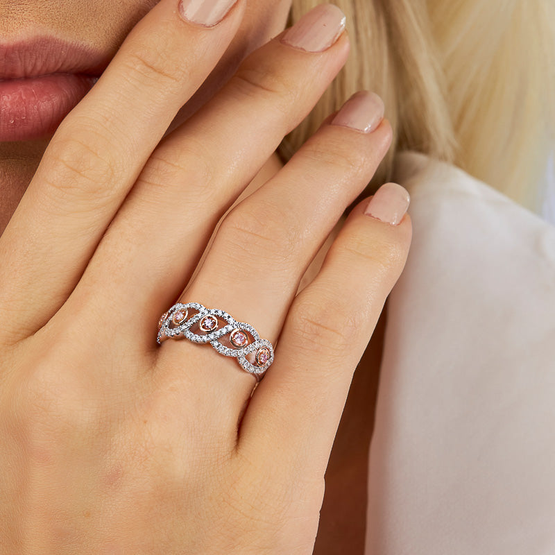 The Kimberley Ellis Ring combines 18ct rose and white gold in an intricate openwork design, with rare Argyle pink diamonds framed in warm rose gold. Accented by a cascade of brilliant white diamonds, it’s a graceful statement of colour, sparkle, and artistry.