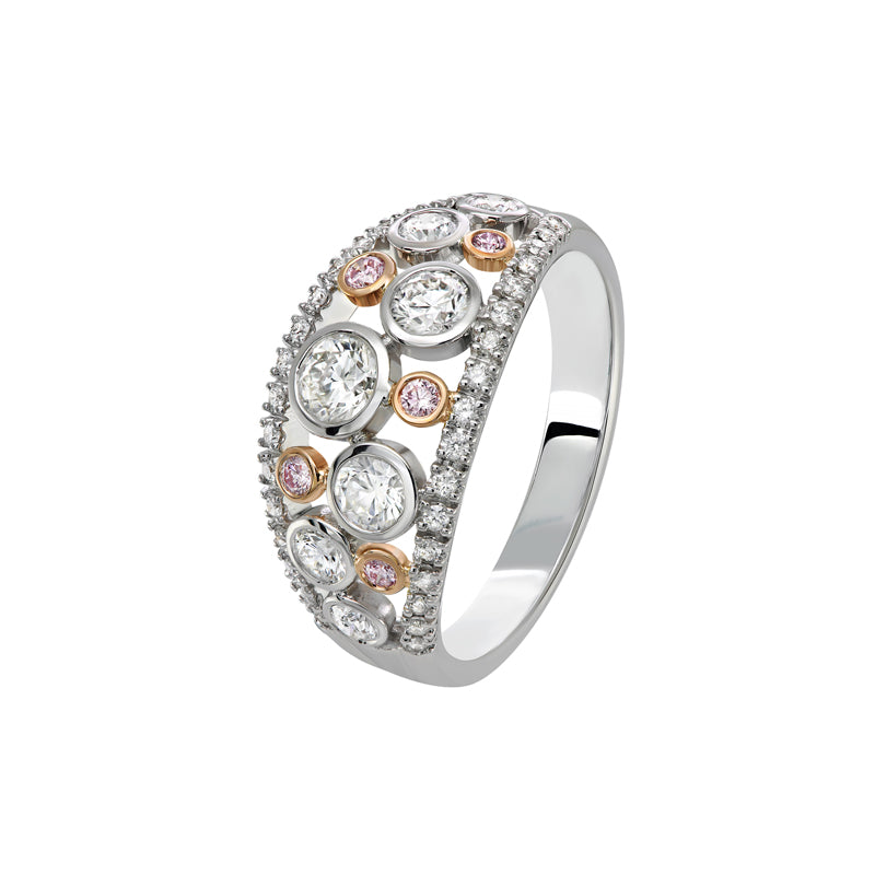 The Kimberley Odette Ring is a bold yet graceful design, crafted in 18ct white and rose gold. Featuring an array of brilliant white diamonds and rare Argyle pink diamonds in bezel settings, the design plays with varying sizes to create movement and depth. Delicate rows of white diamonds frame the composition, adding radiance to this striking statement piece.