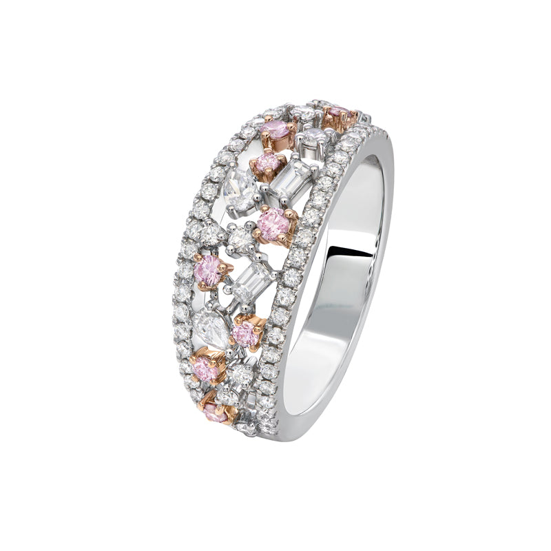Sparkling and beautiful, the Kimberley Splendour of Versailles Ring showcases a stunning arrangement of white diamonds and pink diamonds in a variety of cuts, set between two rows of white diamonds. This ring features pink diamonds from the Argyle mine in Western Australia and has been crafted in 18ct white and rose gold.