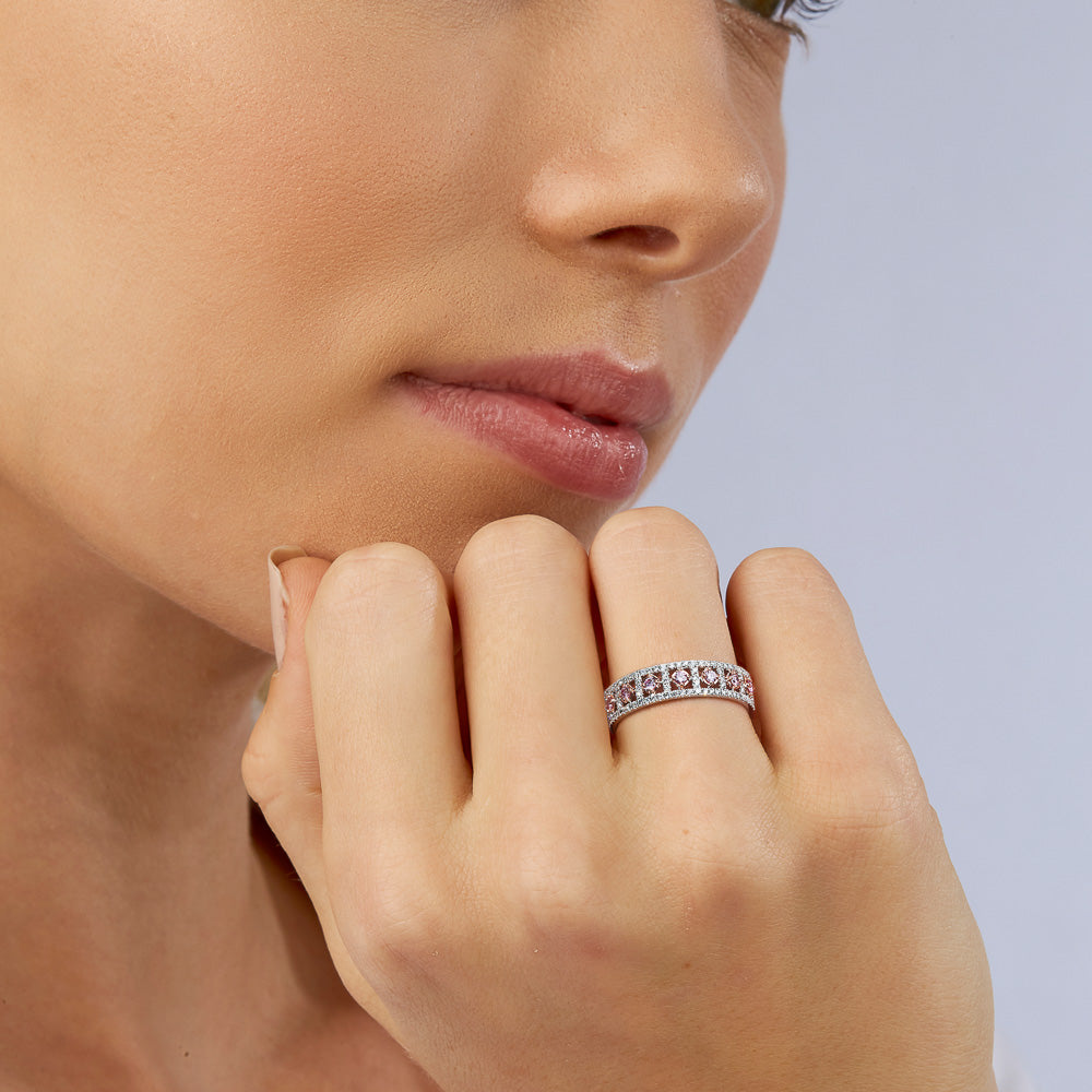 The Kimberley Therese Ring is a graceful celebration of rare beauty, crafted in 18ct white and rose gold. A row of Argyle pink diamonds, each embraced in rose gold, is framed by two delicate bands of sparkling white diamonds. This refined design balances colour and brilliance with timeless elegance, making it a ring of distinction and everlasting charm.
