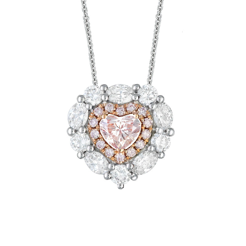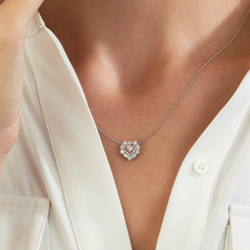 Bold and luxurious, the Kimberley Matisse Necklace showcases a large heart shaped Argyle pink diamond, surrounded by two haloes of pink and white diamonds in different shapes for a unique touch! This piece reflects love and rarity, crafted in 18ct white and rose gold, this piece is reflects Pink Kimberley quality and craftsmanship.