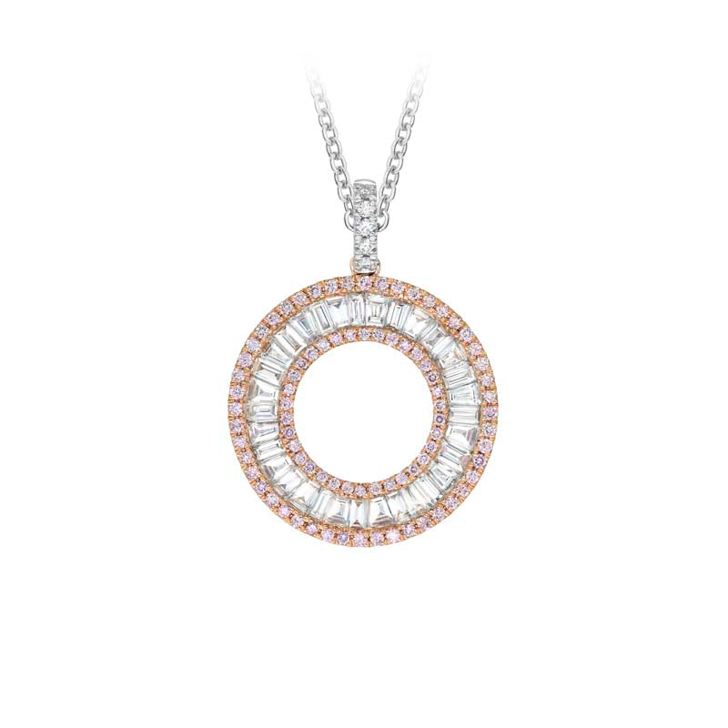 キンバリー・ビンビンビー・ネックレスは、バゲットカットのホワイトダイヤモンドをサークル状にあしらった、息を呑むほど美しい逸品です。アーガイル鉱山産の鮮やかなピンクダイヤモンドを2つのサークル状にセッティングし、その内側にセットされています。ピンクダイヤモンドの繊細で希少な美しさを余すところなく捉え、その輝きを唯一無二の美しさで表現しています。18カラットのホワイトゴールドとローズゴールドで仕立てられています。