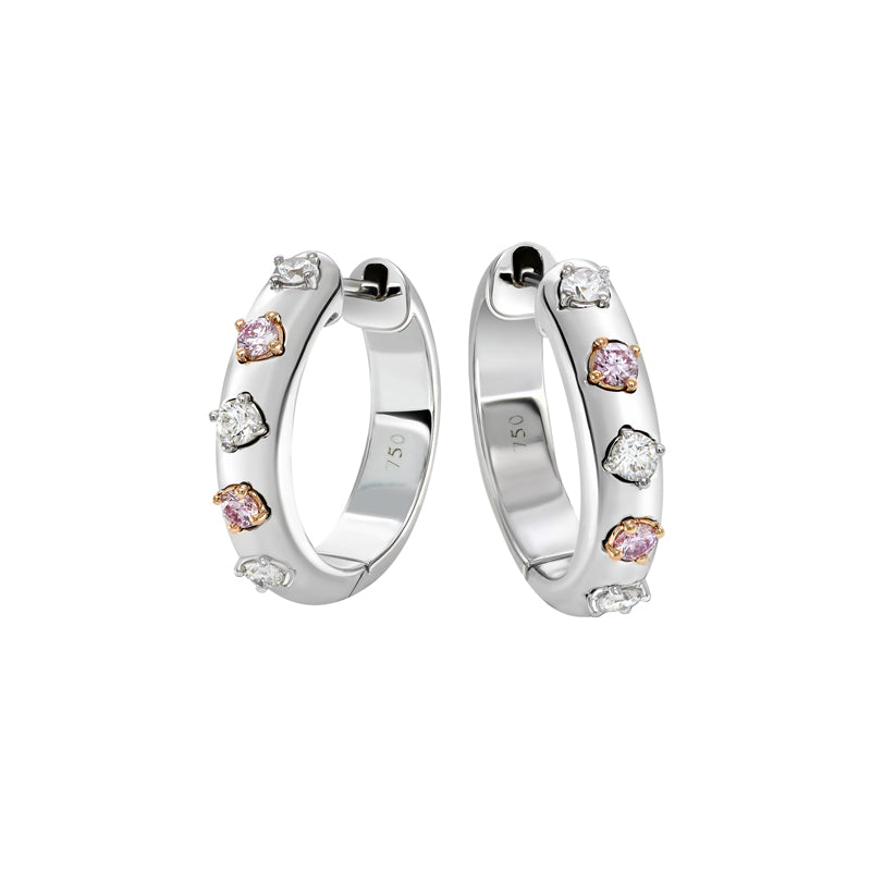 The Kimberley Penny Earrings showcase an elegant hoop design, adorned with a delicate sequence of brilliant white and rare Argyle pink diamonds. Crafted in luminous 18ct white gold, each stone is thoughtfully set to create a soft, radiant shimmer as the hoops catch the light. Celebrating the natural beauty and rarity of Australian pink diamonds, these timeless earrings bring a refined yet modern touch to both everyday wear and special occasions.