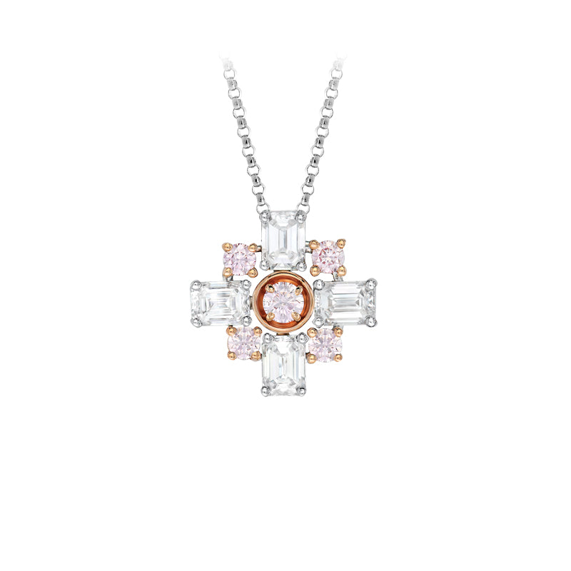 このゴージャスなネックレスは、ラウンドカットのアーガイル ピンク ダイヤモンドとエメラルドカットのホワイト ダイヤモンドを花型にあしらったものです。18 カラットのローズ ゴールドとホワイト ゴールドにセットされています。